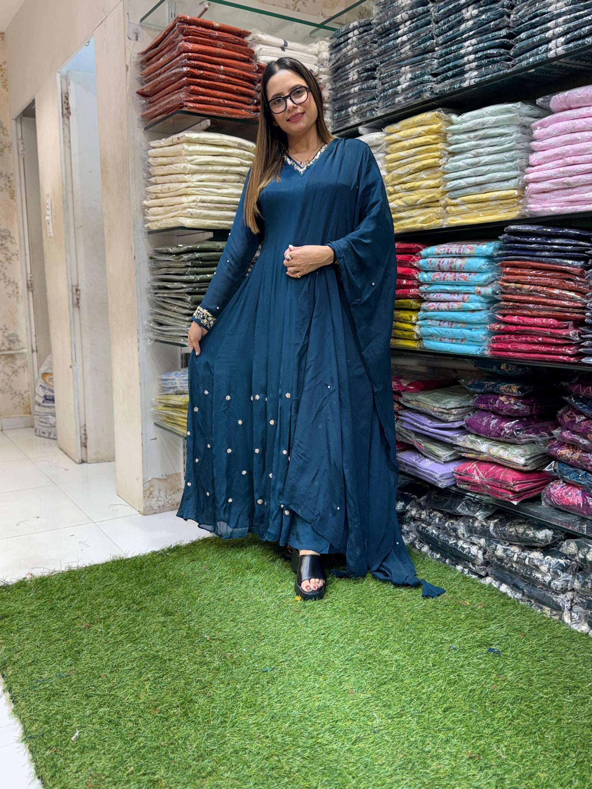 Chinon Peacock Green Anarkali 3pc Set
