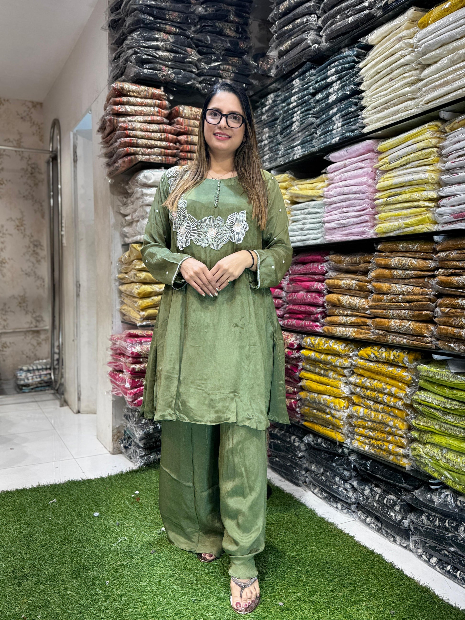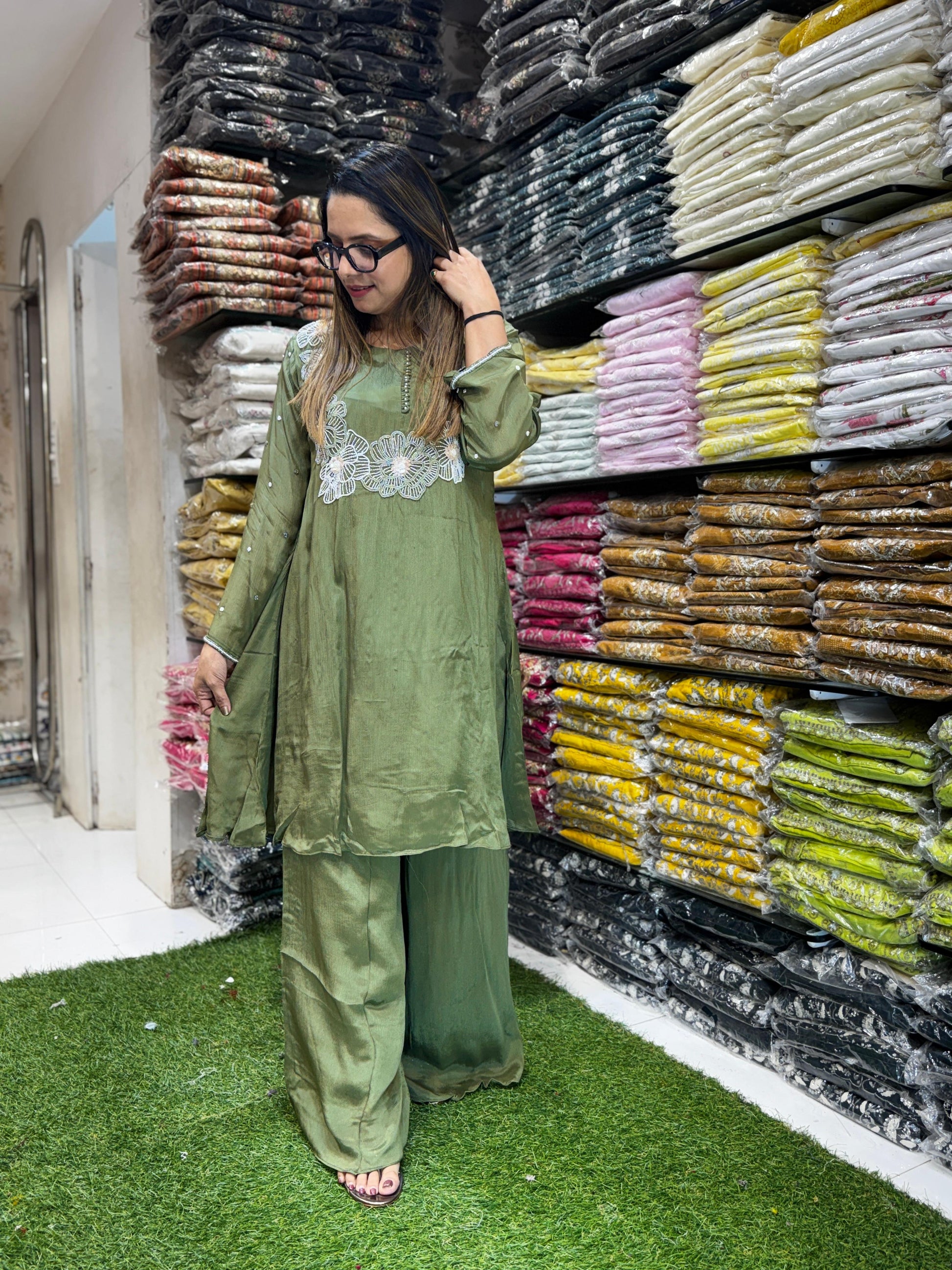 | DETAILS | Culkatta Hand Work Green Color |