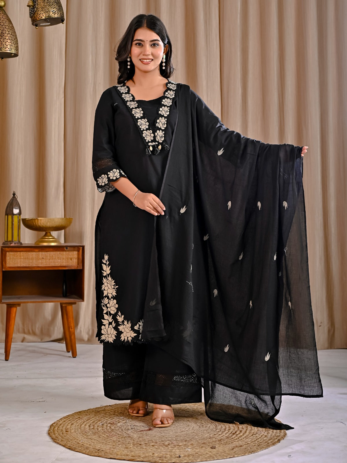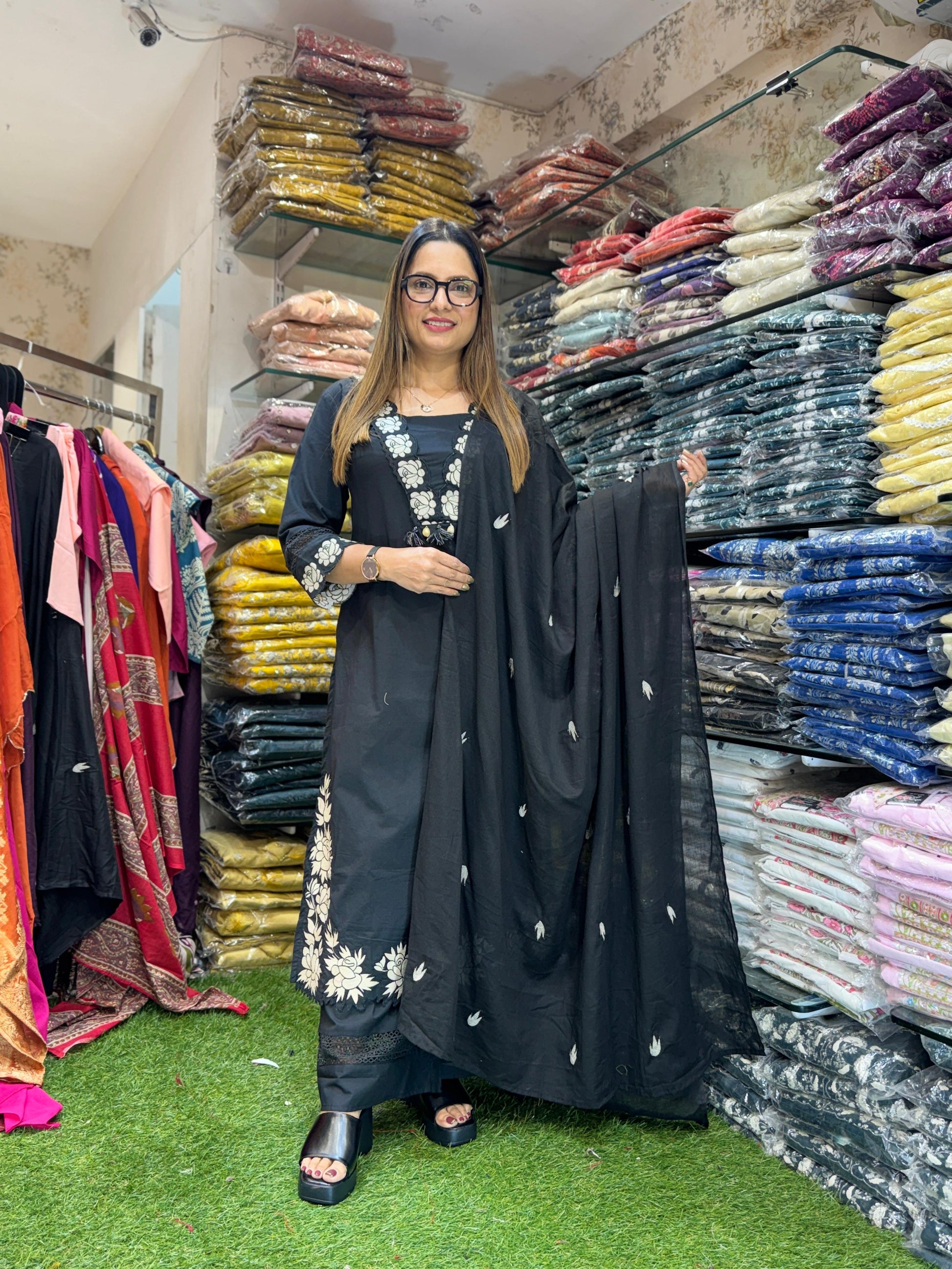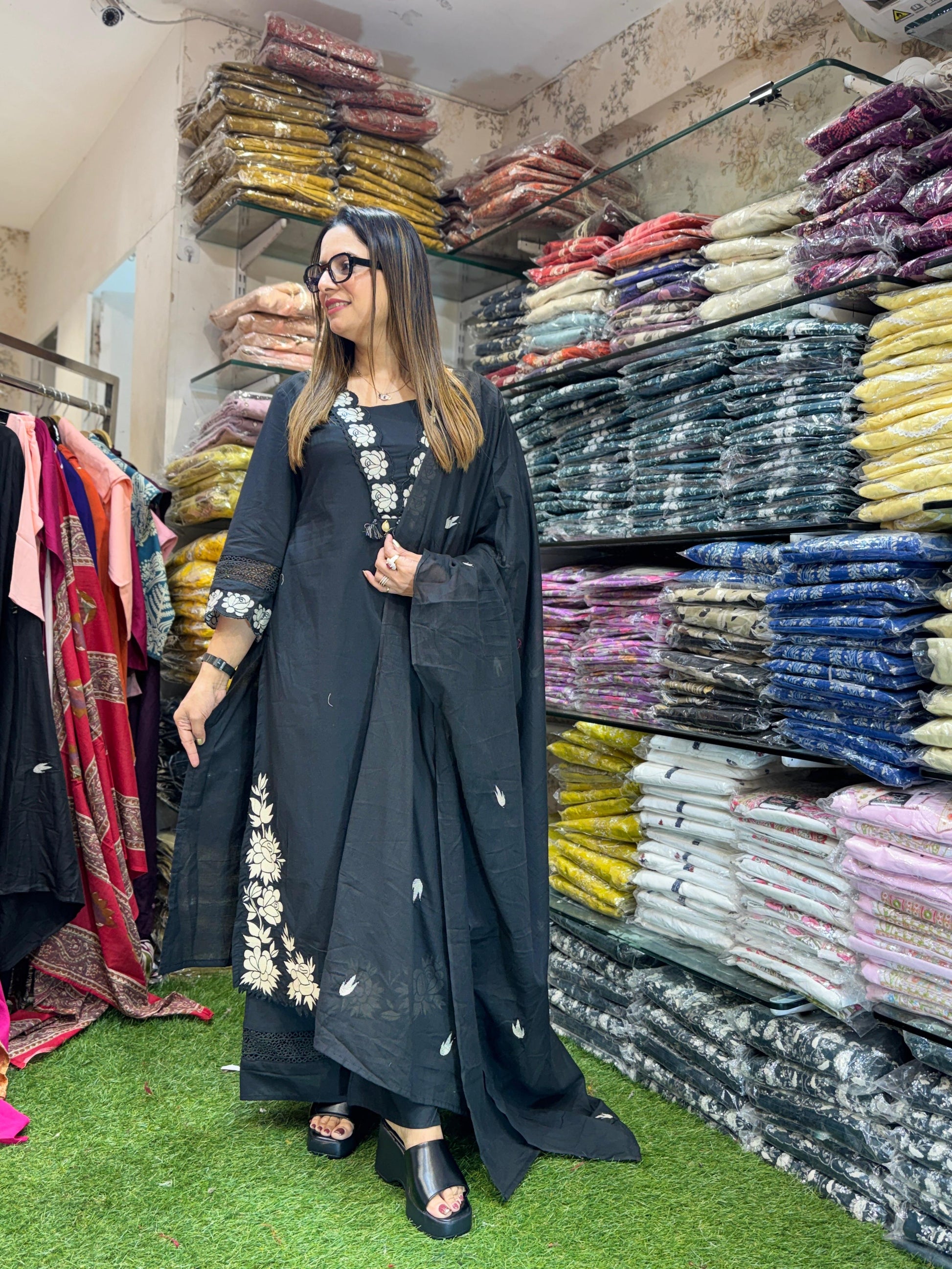 Pure Mull Cotton A- Line 3 pc Suit With Premium Embroidery Work in Pastel or sky blue color