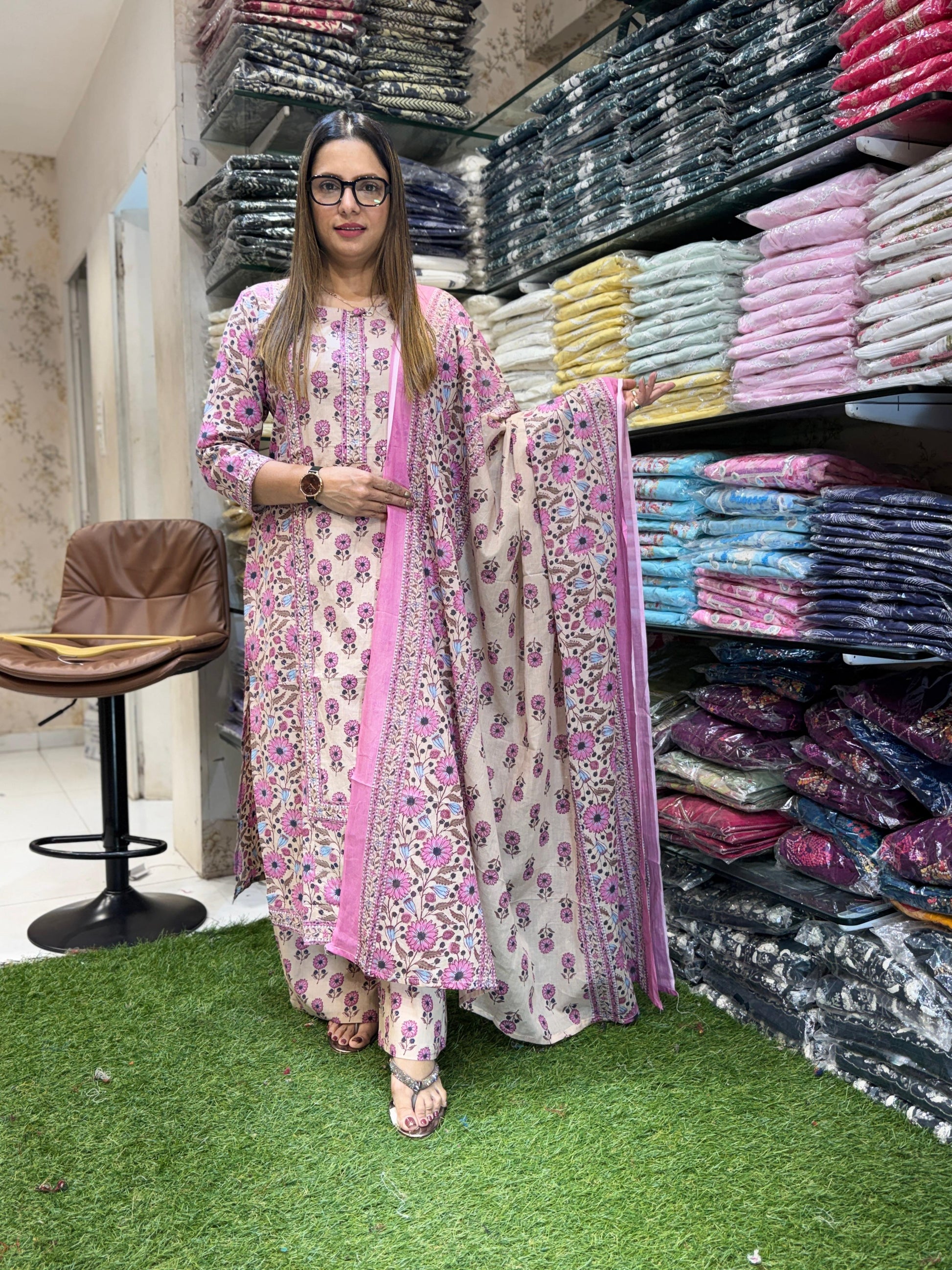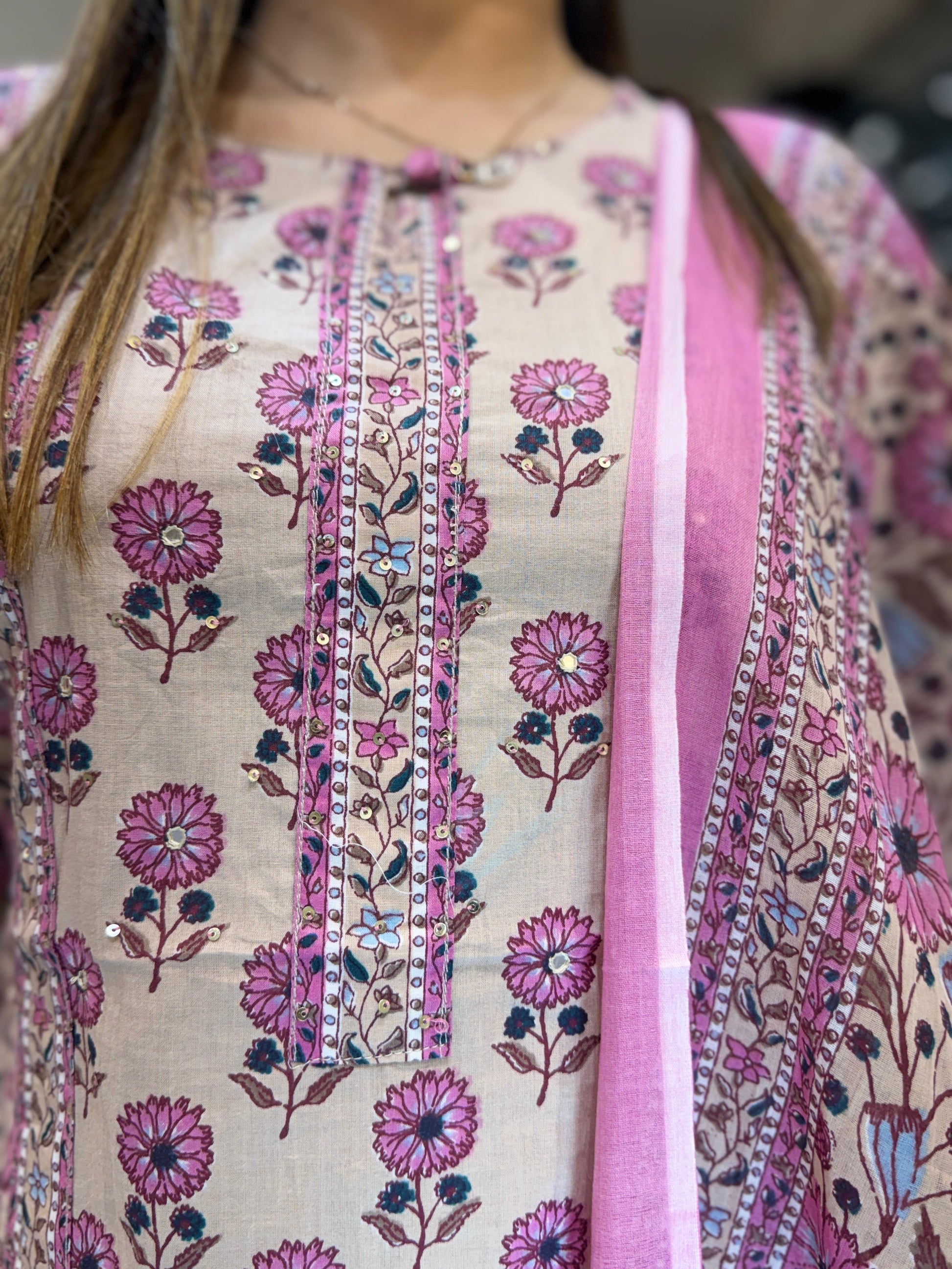 Pure Mull Cotton A- Line 3 pc Suit With Premium Embroidery Work in Pastel or sky blue color