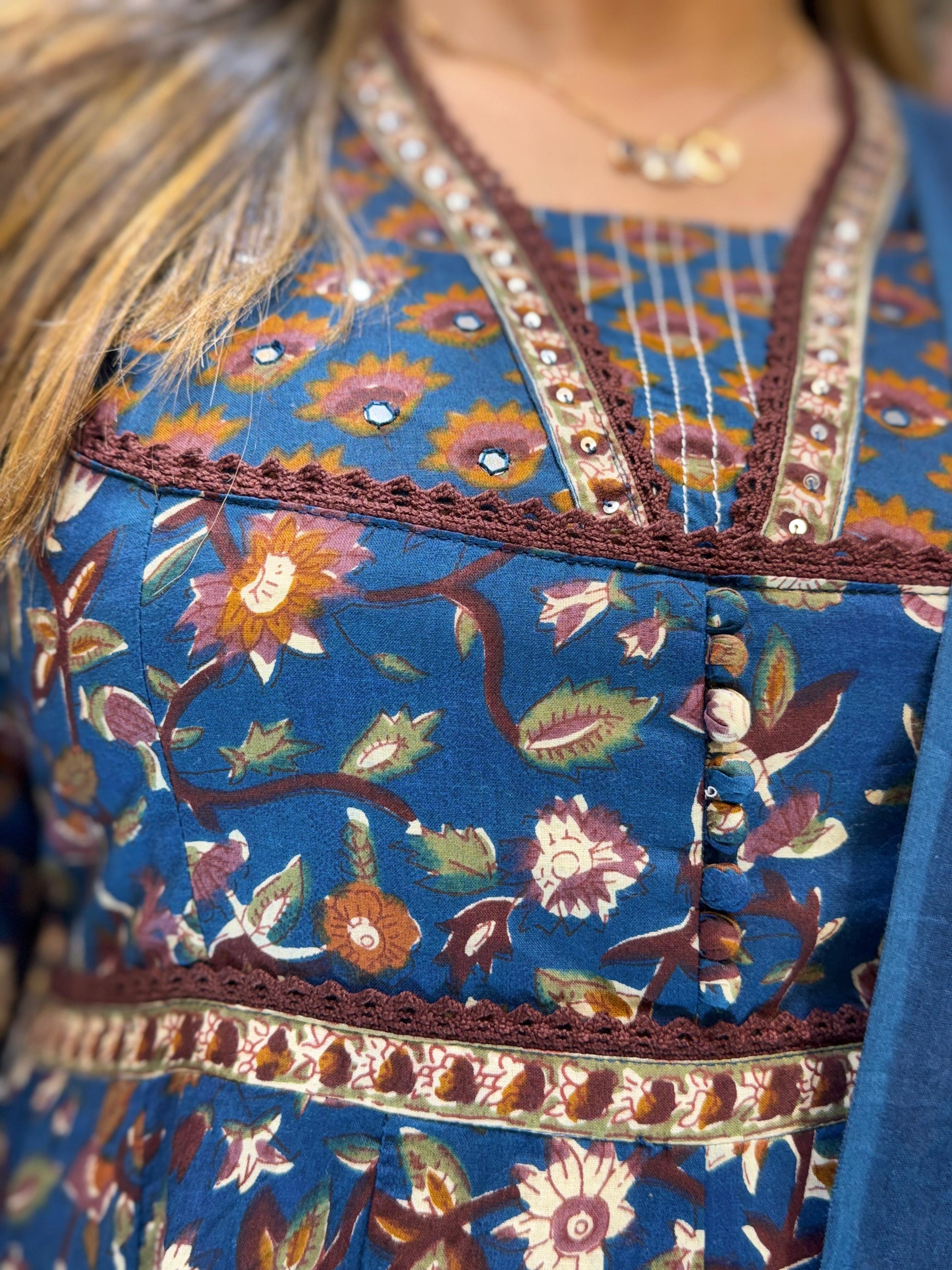 Jaipuri Cotton Blue Anarkali 3pc Set