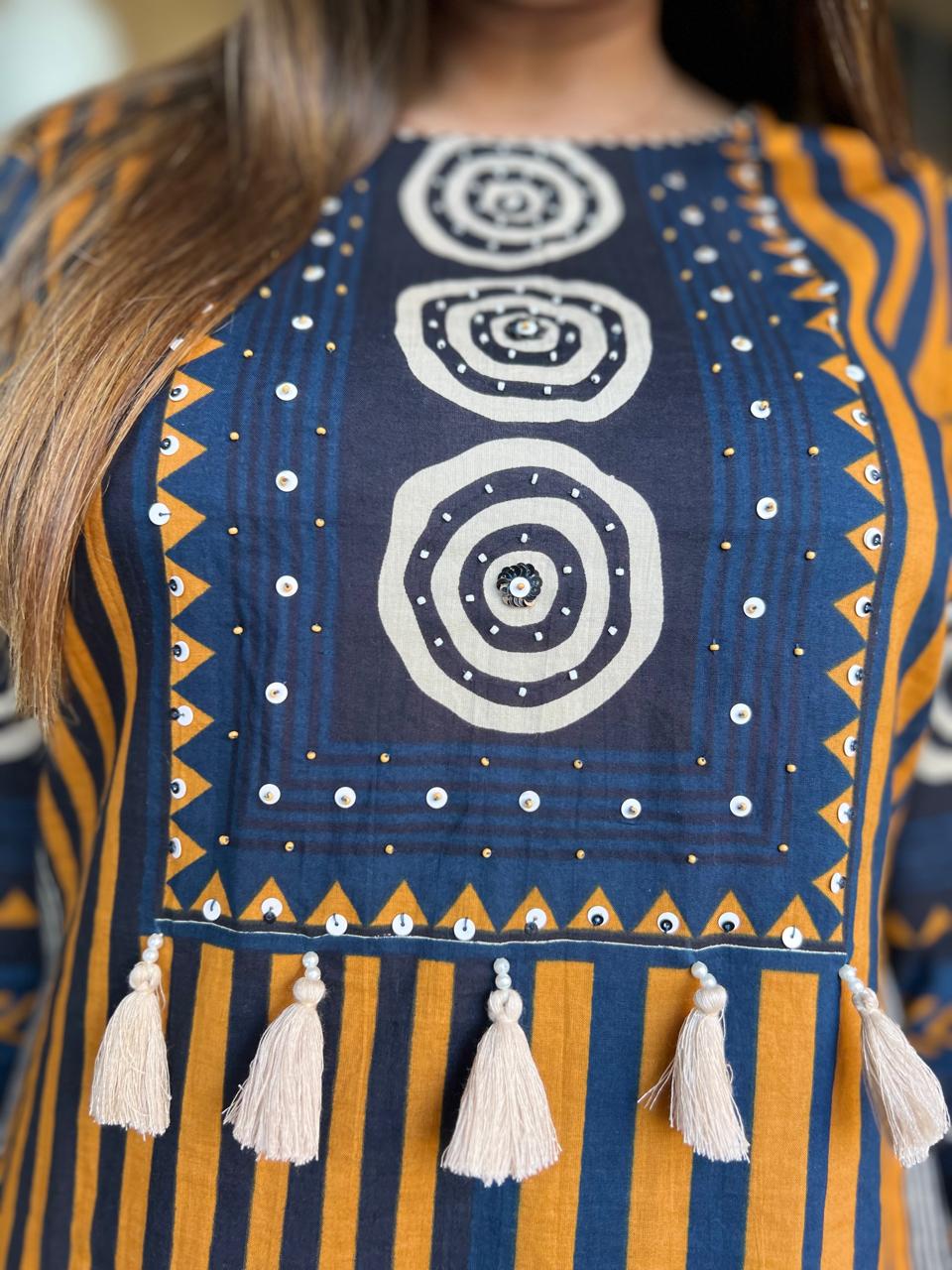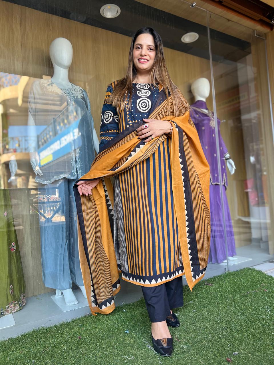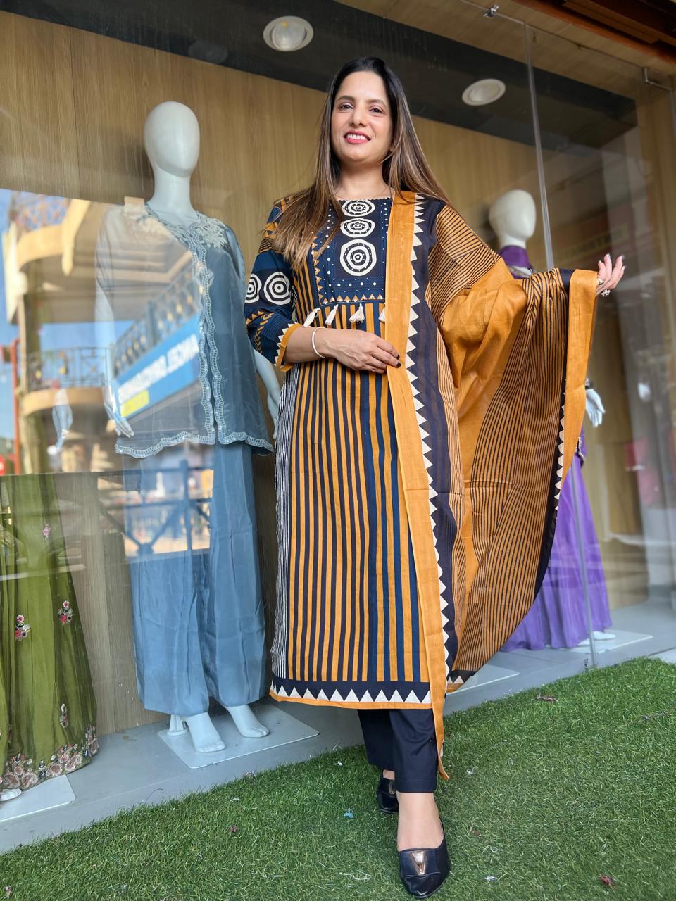 Jaipuri Cotton Blue Anarkali 3pc Set