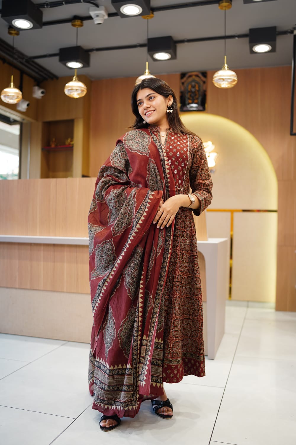 Jaipuri Cotton Maroon Anarkali 3pc Set