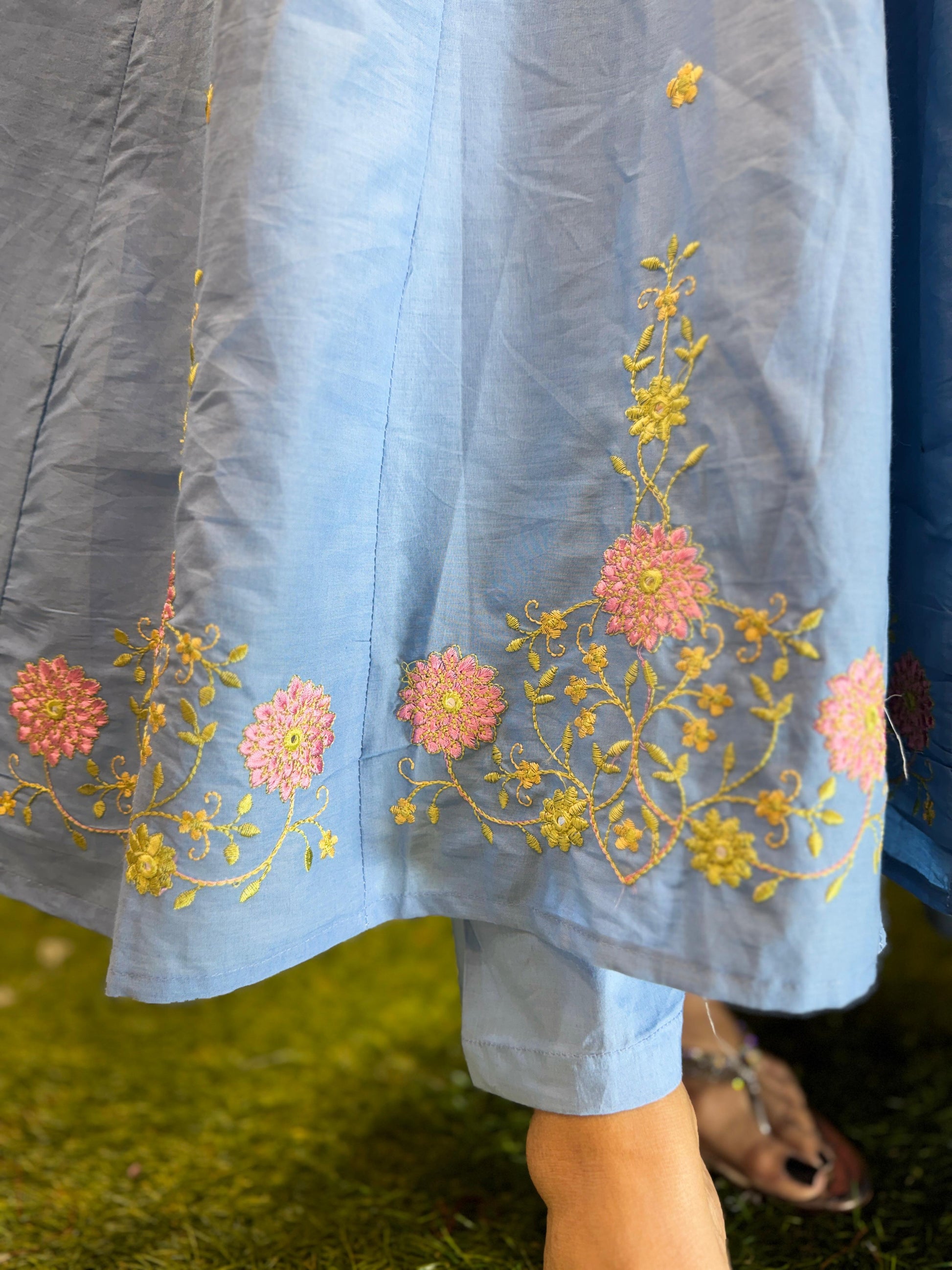 Jaipuri Cotton Sky Blue Anarkali 3pc Set