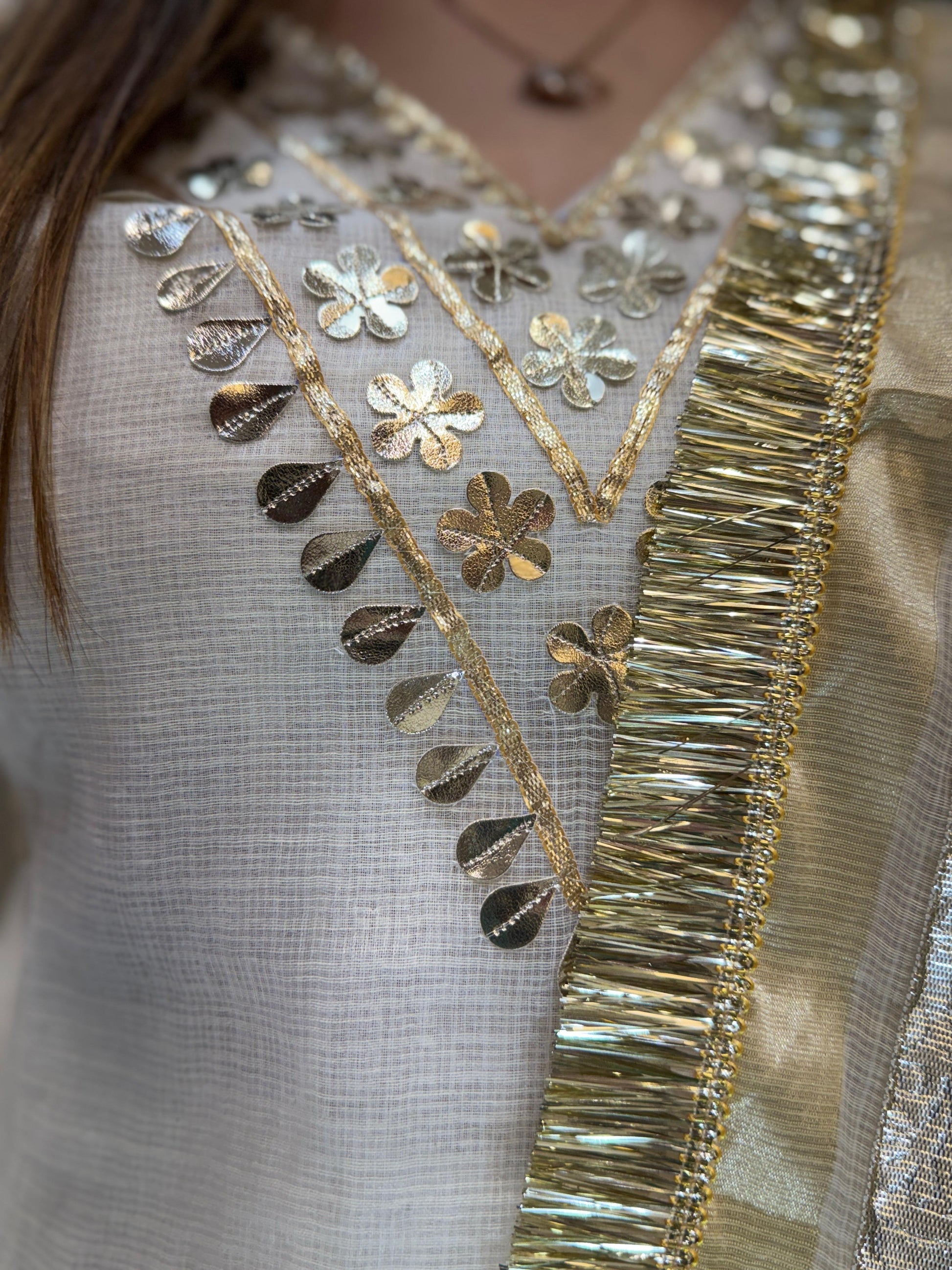 | DETAILS | Lather Flowers And Gota Detailing Work White Color |