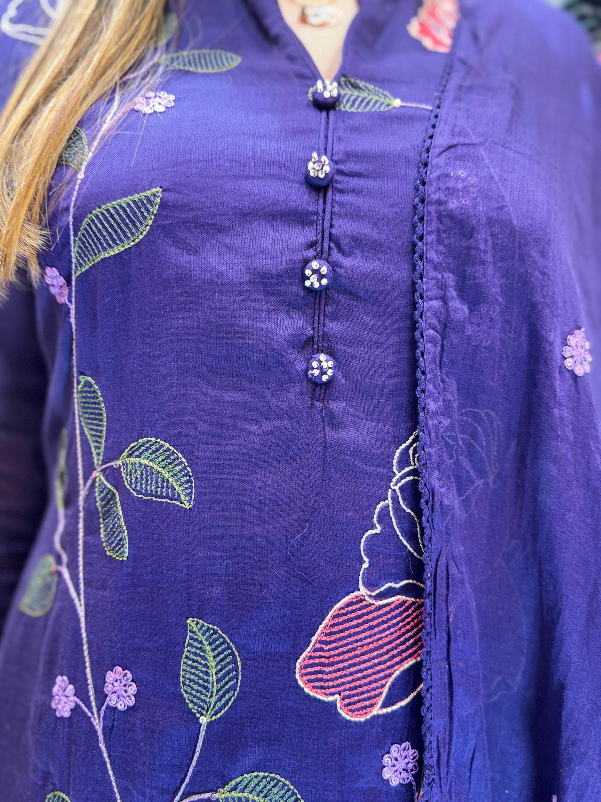 Pure Mull Cotton A- Line 3 pc Suit With Premium Embroidery Work in Pastel or sky blue color