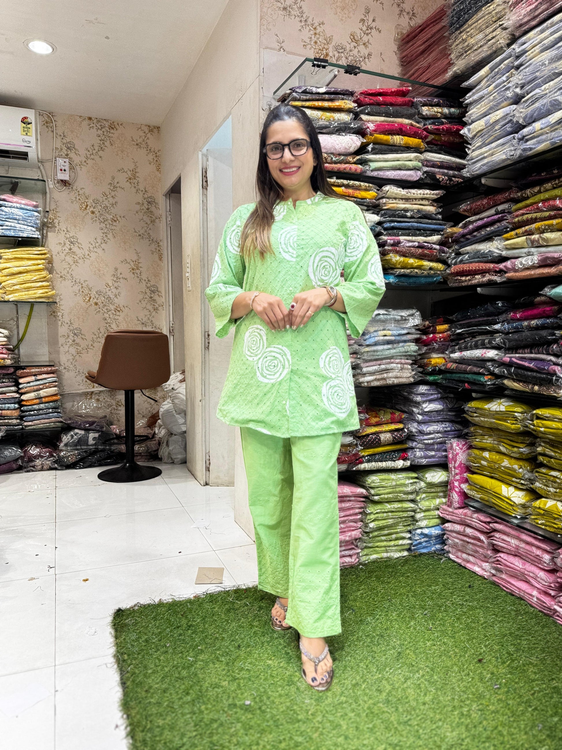 | DETAILS | Schiffli Work Green Color |
